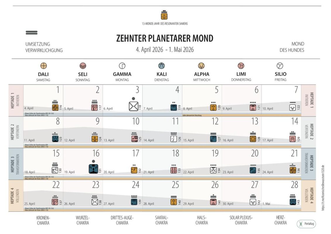 Am 15. und 16. Tag dieses Mondes betreten wir das Zentrum des Tzolkin – Kin 130–131: Kosmischer Hund und Magnetischer Affe, den Wendepunkt des 260-Tage-Zyklus, der mit der Gelben Kosmischen Sonne (26. August 2026) endet. (Siehe Blaue Kosmische Hand – Randy Bruners Bericht.)
